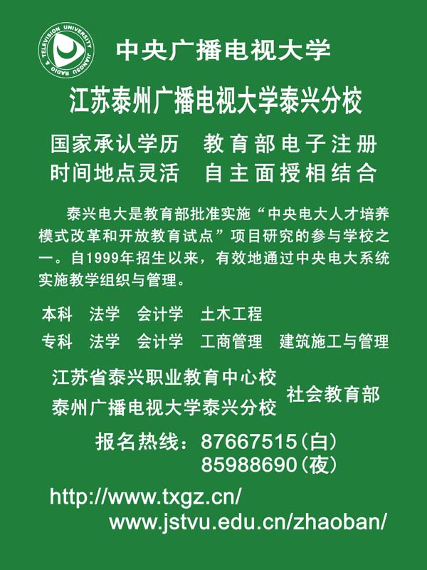 江蘇泰州廣播電視大學泰興分校招生信息