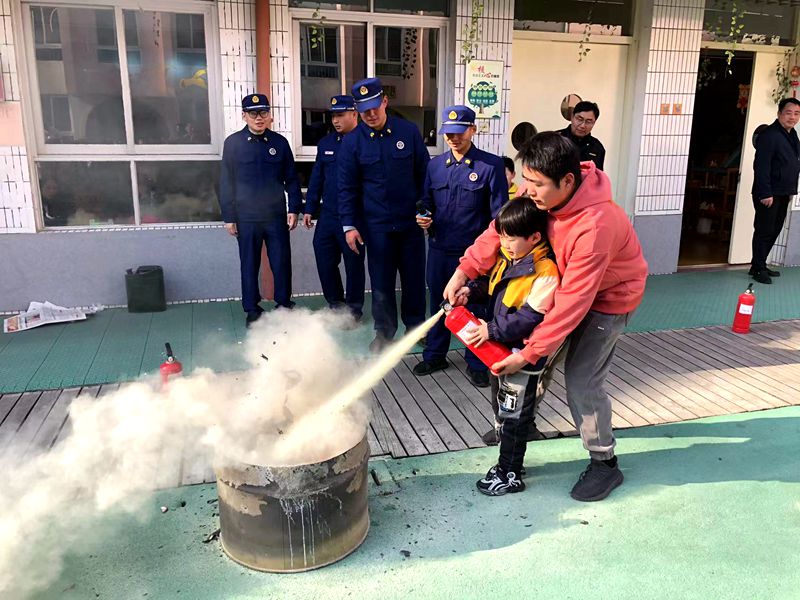 緊接著,大班小朋友運用學(xué)到的知識,在消防員的指導(dǎo)下有序進行消防逃生演練活動。在最后的互動體驗環(huán)節(jié),消防員給大家講解、演示滅火器的使用方法:做到一提二拔三握四對五噴,隨后教師和家長代表們按照滅火器的使用方法,現(xiàn)場進行了滅火演練。