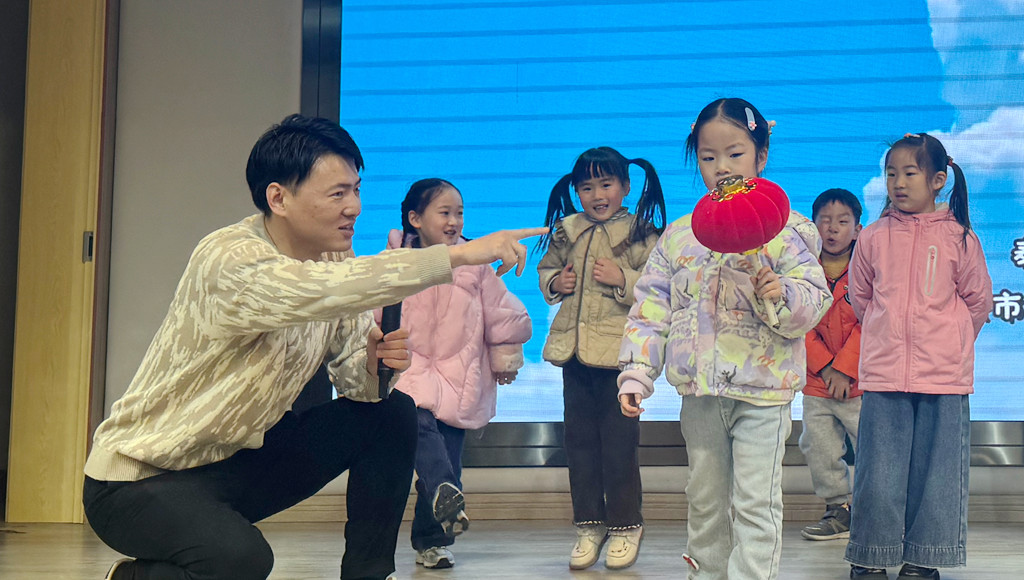 非遺傳承人——胡盛,走進文江園,他用故事串聯(lián)泰興花鼓的歷史脈絡,講述了泰興花鼓的起源、發(fā)展以及表演技巧,并現(xiàn)場示范、教授“顛三步”“喜鵲登梅步”“四方步”等經(jīng)典步伐。孩子們看得目不轉睛,躍躍欲試。胡盛老師耐心地蹲下身子,手把手指導孩子們調(diào)整姿勢。漸漸地,孩子們的動作從笨拙到流暢,會場里洋溢著歡聲笑語。