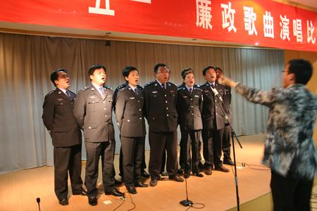 作為“五一警體周”活動的一部分,4月24日晚,泰興市公安局結合社會主義榮辱觀教育,舉辦了慶“五一”廉政歌曲演唱比賽,從而正式拉開了該局今年“五一警體周”活動的序幕。此次比賽有20多個單位、部門的140多名民警參加,比賽的優勝單位將代表該局參加全市廉政歌曲演唱比賽。圖為市看守所民警正在演《公務員之歌》。(陸裕順)
