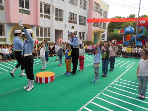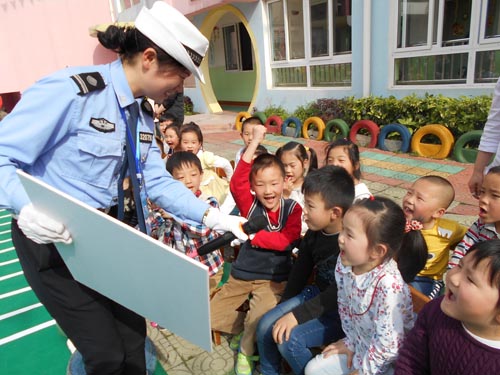 為了進一步落實交通安全宣傳從娃娃抓起,5月6日下午 “全國巾幗文明崗”——江蘇省泰興公安交警大隊女子班的“警花“們來到泰興市中心幼兒園開展道路交通安全宣傳活動。她們為中心幼兒園的小朋友設置了模擬交通路口、紅綠燈、交通標志標線,和小朋友一起做交通安全小游戲、開展交通指揮手勢表演、交通安全有獎競答、交通標志圖片識別,通過系列的活動使小朋友們認識交通、體驗交通、了解交通、關注交通,同時教育了小朋友們在日常的生活中注意交通安全。活動共有300余名師生參加,受到了孩子們喜愛。( 張繼軍 黃新麗)