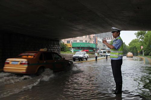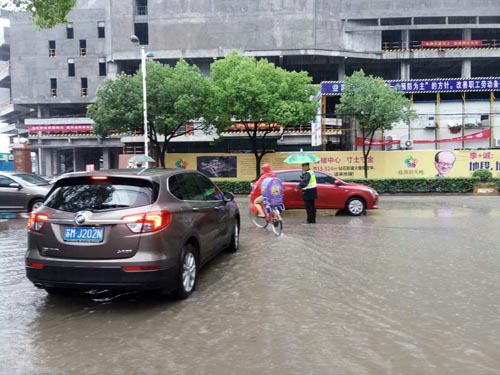 張繼軍 黃新麗 7月2至6日泰興連續(xù)強(qiáng)降雨,僅3日一天的降雨量就達(dá)100mm,泰興市范圍內(nèi)主次干道因此出現(xiàn)了大面積積水現(xiàn)象,給過往車輛、行人帶來了諸多交通安全隱患。風(fēng)雨面前,泰興交警選擇了勇敢堅(jiān)守。