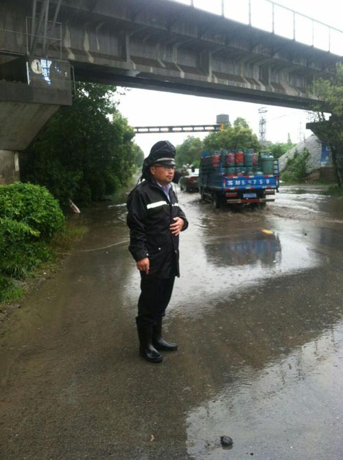 2日上午7時(shí),正在關(guān)注微信的泰興公安交警大隊(duì)城區(qū)中隊(duì)中隊(duì)長王文宏在微信中看到市民發(fā)來的照片,大慶路、羌溪路部分路段出現(xiàn)積水,影響車輛通行。雨情就是警情,雨情就是命令。他迅速電話動(dòng)員,果斷啟動(dòng)中隊(duì)惡劣天氣處置預(yù)案,帶領(lǐng)全隊(duì)民警主動(dòng)出擊、積極應(yīng)對(duì),雨中堅(jiān)守路面執(zhí)勤一線。特別是大慶路、羌溪路等路段積水嚴(yán)重,羌溪路鎮(zhèn)海門橋下的低洼處積水超過了15厘米,他利用口哨、喊話器提醒過往車輛減速慢行,指揮、疏導(dǎo)車輛有序通行,雖然積水漫過了他的雙腳,可他全然不顧,與過往車輛“零距離”接觸,扯開嗓門一遍又一遍的叮囑駕駛?cè)吮3职踩囁佟6c此同時(shí),他的褲兜里一遍一遍地響起家里的電話,在20公里外的黃橋,70多歲的父母家里,因暴雨侵濁屋頂多處發(fā)生漏雨……最后,引以為傲、穿警服的大兒子沒回家,倒是在工廠忙碌的弟弟心急火燎地往家趕。