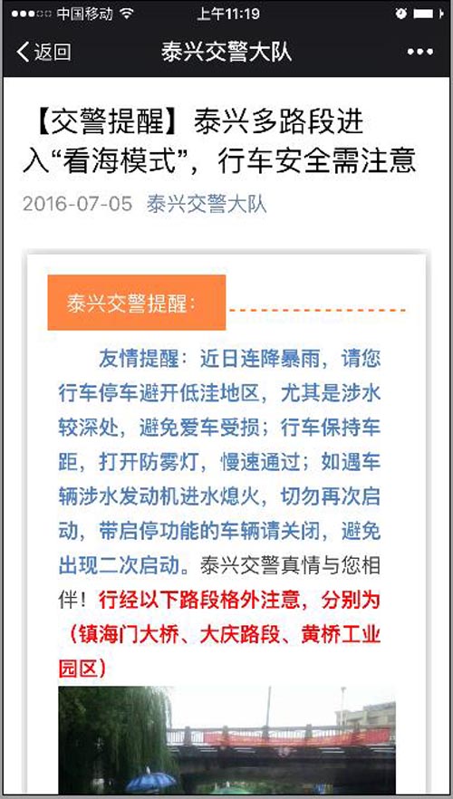 風(fēng)在、雨在,泰興交警蜀黍也在!“駕駛員朋友們,近日連降暴雨,請(qǐng)您行車停車避開低洼地區(qū)……”“目前泰興市區(qū)發(fā)現(xiàn)重點(diǎn)積水路面有古墩線古溪鐵路大橋等共6處,請(qǐng)車輛駕駛?cè)死@行,感謝您的配合,泰興交警與您相伴。”一條條短信、微信、語音小喇叭一瞬間全面鋪開,朋友圈、微信群,一張張危險(xiǎn)路段訊息在時(shí)時(shí)提醒。各基層交警中隊(duì)人員全部上路,排除險(xiǎn)情,人手不夠時(shí),抽調(diào)友鄰中隊(duì)人員互幫互助;同時(shí)又各自為陣,在轄區(qū)所有主次干道來回巡邏,檢查交通標(biāo)志、隔離欄的損毀情況,密集注意險(xiǎn)橋、險(xiǎn)段等交通安全隱患,清理路面樹枝、砂石,設(shè)置警示標(biāo)牌及臨時(shí)警示措施,確保過往車輛安全。僅3日一天,緊急排險(xiǎn)15處,定點(diǎn)疏導(dǎo)交通31處,發(fā)送短信提醒16條,接收轉(zhuǎn)發(fā)、微信群眾約3萬余人。
