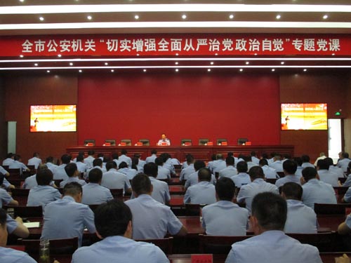 6月30日上午,泰興市公安局開(kāi)展“全面從嚴(yán)治黨”專題黨課活動(dòng),課前組織觀看了《警鐘》警示教育片,副市長(zhǎng)、局黨委書(shū)記、局長(zhǎng)李雙山出席教育活動(dòng),并作了題為《旗幟鮮明講政治做忠誠(chéng)人民衛(wèi)士以優(yōu)異成績(jī)迎接黨的十九大勝利召開(kāi)》的專題黨課輔導(dǎo)。李雙山同志指出,旗幟鮮明講政治,就是要大力弘揚(yáng)公安英模精神,把“對(duì)黨忠誠(chéng)、服務(wù)人民、執(zhí)法公正、紀(jì)律嚴(yán)明”總要求落實(shí)到公安工作的全方面、全過(guò)程,緊緊圍繞年初提出的“雙升雙爭(zhēng)”的工作目標(biāo),以深化“五大警務(wù)”為依托,進(jìn)一步提振精氣神、凝聚正能量,以更加堅(jiān)定的信念、更加高昂的斗志、更加過(guò)硬的作風(fēng),深入推進(jìn)泰州市局提出的“創(chuàng)新推動(dòng)、數(shù)據(jù)引領(lǐng)、能力提升”三大主題工程,全力以赴抓好以“十九大”安保為主題主線的下半年各項(xiàng)工作,用實(shí)際行動(dòng)、過(guò)硬業(yè)績(jī)真正把“十六字”總要求體現(xiàn)在全部的公安工作中。李雙山同志強(qiáng)調(diào),全市公安機(jī)關(guān)廣大黨員、廣大民警:一要鑄就忠誠(chéng)警魂、保持公安本色;二是提供優(yōu)質(zhì)服務(wù)、贏得群眾支持;三是加強(qiáng)法治建設(shè)、促進(jìn)公平正義;四是推進(jìn)改革創(chuàng)新、提升公安質(zhì)效;五是嚴(yán)格紀(jì)律規(guī)矩、培養(yǎng)優(yōu)良警風(fēng)。局班子全體成員,各單位部門(mén)主要負(fù)責(zé)人及部分黨員民警代表、警風(fēng)警紀(jì)監(jiān)督員參加了教育活動(dòng)。