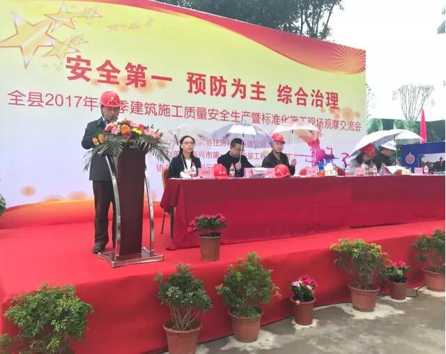 3月29日,由射洪縣住房和城鄉(xiāng)建設(shè)局主辦、泰興市第一建筑安裝工程有限公司承辦、四川云辰置業(yè)有限公司協(xié)辦的射洪縣“全縣2017年春季建筑施工質(zhì)量安全生產(chǎn)工作暨標(biāo)準(zhǔn)化施工現(xiàn)場(chǎng)觀摩交流會(huì)”在河?xùn)|經(jīng)開(kāi)區(qū)云辰國(guó)際項(xiàng)目地順利召開(kāi)。 射洪縣住建局黨委書(shū)記、局長(zhǎng)黃偉,縣住建局黨委委員、副局長(zhǎng)陳鋼,縣建設(shè)工程質(zhì)量安全監(jiān)督站站長(zhǎng)衡順,縣住建局監(jiān)察執(zhí)法大隊(duì)隊(duì)長(zhǎng)倪長(zhǎng)生,縣住建局村鎮(zhèn)股股長(zhǎng)楊利銳,泰興一建公司西南分公司總經(jīng)理印輝,四川云辰置業(yè)有限公司總經(jīng)理張怡及全縣五大國(guó)有平臺(tái)公司、15家建筑總承包企業(yè)、7家監(jiān)理企業(yè)、52個(gè)在建項(xiàng)目、部分易地扶貧搬遷建設(shè)代表參加了此次觀摩交流會(huì)。