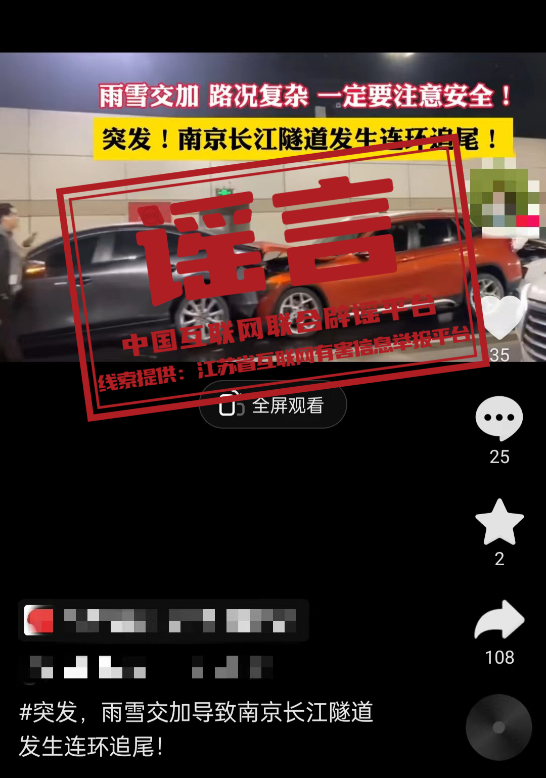 真相:12月18日,南京普降大雪,網上流傳一條關于“過江隧道多輛汽車連環追尾”的視頻,并以此提醒網民“下雪天注意路滑”“能不開車就不開車”,引發關注。經向公安部門核實,視頻中的事故發生在2021年4月1日南京江山大街隧道內。截至目前,南京市各隧道內暫未發生較大交通事故。 在此提醒廣大網民,不隨意轉發沒有權威和正規來源的截圖、視頻、音頻信息。不傳謠、不信謠,共同營造清朗網絡空間。(來源:江蘇省互聯網有害信息舉報平臺、“南京網絡辟謠”微信公眾號)