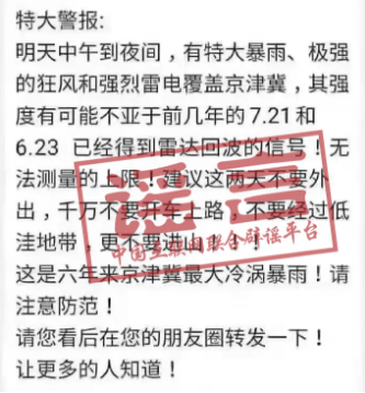 7月上旬,北方迎來汛情,一則“京津冀將迎特大暴雨”的“警報”刷屏朋友圈。事實上,該則謠言早在2017年6月下旬京津冀大雨期間就已流傳。這則謠言中的“特大”“無法測量”“絕對”等字眼,引發人們的好奇心,博得了大量關注。