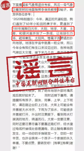 災情愈重,謠言愈甚。此時誕生了一種謠言套路:將汛情成因歸結為子虛烏有的天象——“180年周期白元年”“地球引力場、磁場紊亂”等。7月中旬,該謠言利用今年這場覆蓋面廣、持續時間長的強降雨,刷了一波錯誤認知。