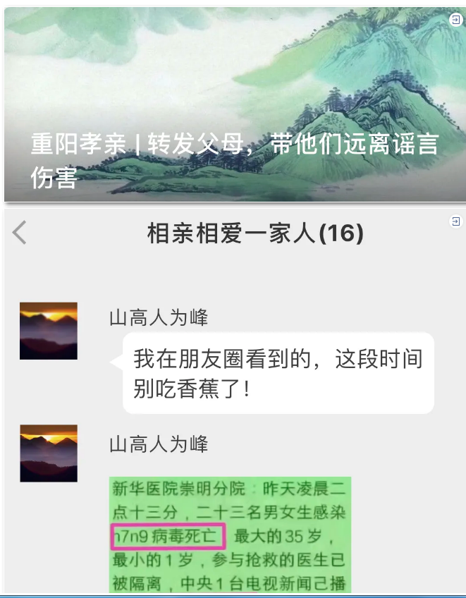 針對老年群體較容易被謠言欺騙、家族群是傳謠重災(zāi)區(qū)的現(xiàn)實情況,我不斷鼓勵年輕一代以積極的心態(tài),主動幫助長輩們識破謠言的慣用伎倆,將謠言“扼殺”在自家群中。