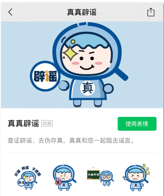 我為自己設(shè)計了一個可愛的卡通形象——真真,在微信表情商店上線了16款表情,讓辟謠“動起來”,在指尖傳遞正能量。同時,我還推出了“真真說”系列辟謠短視頻,用生動可愛的方式將辟謠知識傳遞給大家,寓教于樂。