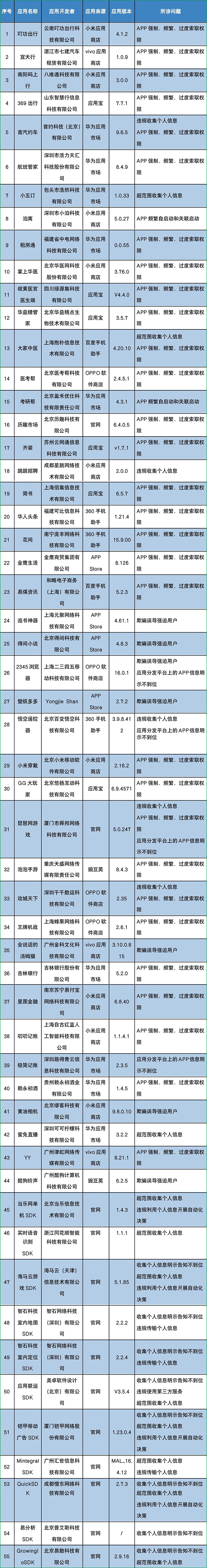 今日提示 通報:工信部通報!這55款A(yù)PP(SDK)存在侵權(quán)行為 詳情:依據(jù)《個人信息保護法》《網(wǎng)絡(luò)安全法》《電信條例》《電信和互聯(lián)網(wǎng)用戶個人信息保護規(guī)定》等法律法規(guī),近期,工業(yè)和信息化部組織第三方檢測機構(gòu)對群眾關(guān)注的生活服務(wù)、休閑娛樂、實用工具等移動互聯(lián)網(wǎng)應(yīng)用程序(APP)及第三方軟件開發(fā)工具包(SDK)進行檢查,發(fā)現(xiàn)其中55款存在侵害用戶權(quán)益行為。工業(yè)和信息化部對相關(guān)APP及SDK進行通報,要求其按照有關(guān)規(guī)定進行整改,整改落實不到位的,將依法依規(guī)組織開展相關(guān)處置工作。(來源:工業(yè)和信息化部信息通信管理局) 工業(yè)和信息化部通報存在問題的APP(SDK)名單