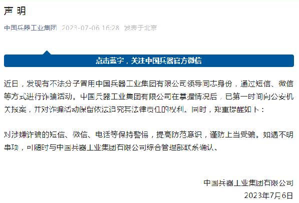 (圖片來源:“中國兵器工業集團”微信公眾號截圖) 真相:中國兵器工業集團有限公司發布聲明稱,近日,發現有不法分子冒用中國兵器工業集團有限公司領導同志身份,通過短信、微信等方式進行詐騙活動。中國兵器工業集團有限公司在掌握情況后,已第一時間向公安機關報案,并對詐騙活動保留依法追究其法律責任的權利。鄭重提醒公眾接到涉嫌詐騙的短信、微信、電話要保持警惕,注意核實信息,避免上當受騙。(來源:“中國兵器工業集團”微信公眾號)