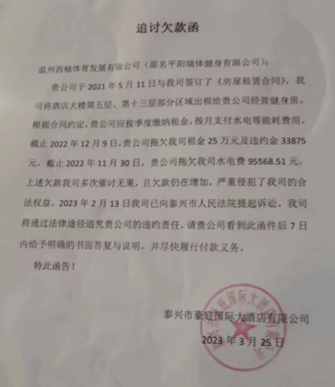 從該函中可見 健身中心拖欠酒店租金25萬(wàn)元 違約金3萬(wàn)3千余元 水電費(fèi)9萬(wàn)5千余元
