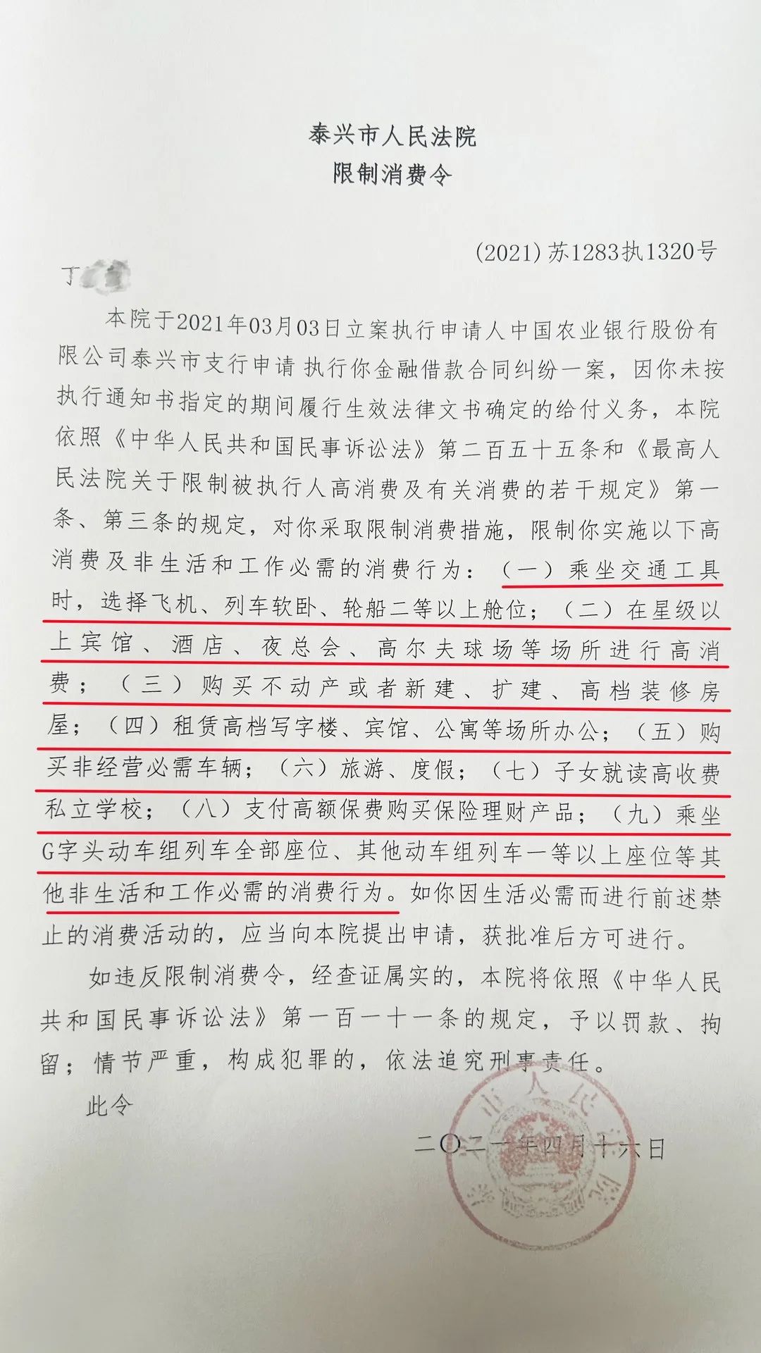 基本案情 泰興法院在執行申請執行人中國農業銀行股份有限公司泰興市支公司與被執行人丁某金融借款糾紛一案中,因被執行人丁某未按執行通知書指定的期間履行生效法律文書確定的給付義務,法院于2021年4月16日對被執行人丁某發出限制消費令。