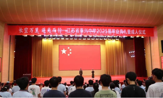 在江蘇省泰興中學,“長空萬里 逐光而行”2025屆畢業典禮暨成人儀式正在舉行。暖場視頻中的三年青春片段,瞬間將全場師生拉入那段名為“青春”的歲月長河。在激昂的國歌聲中,畢業典禮正式拉開帷幕。歌曲《你曾是少年》、贈送《憲法》、佩戴成人帽、莊嚴宣誓、頒發畢業證書等環節,為美好而充滿期望的高中生活畫上圓滿句號,也將星辰大海裝進學子們的行囊,激勵大家以問道而行的精神,追尋志在千里的夢想。