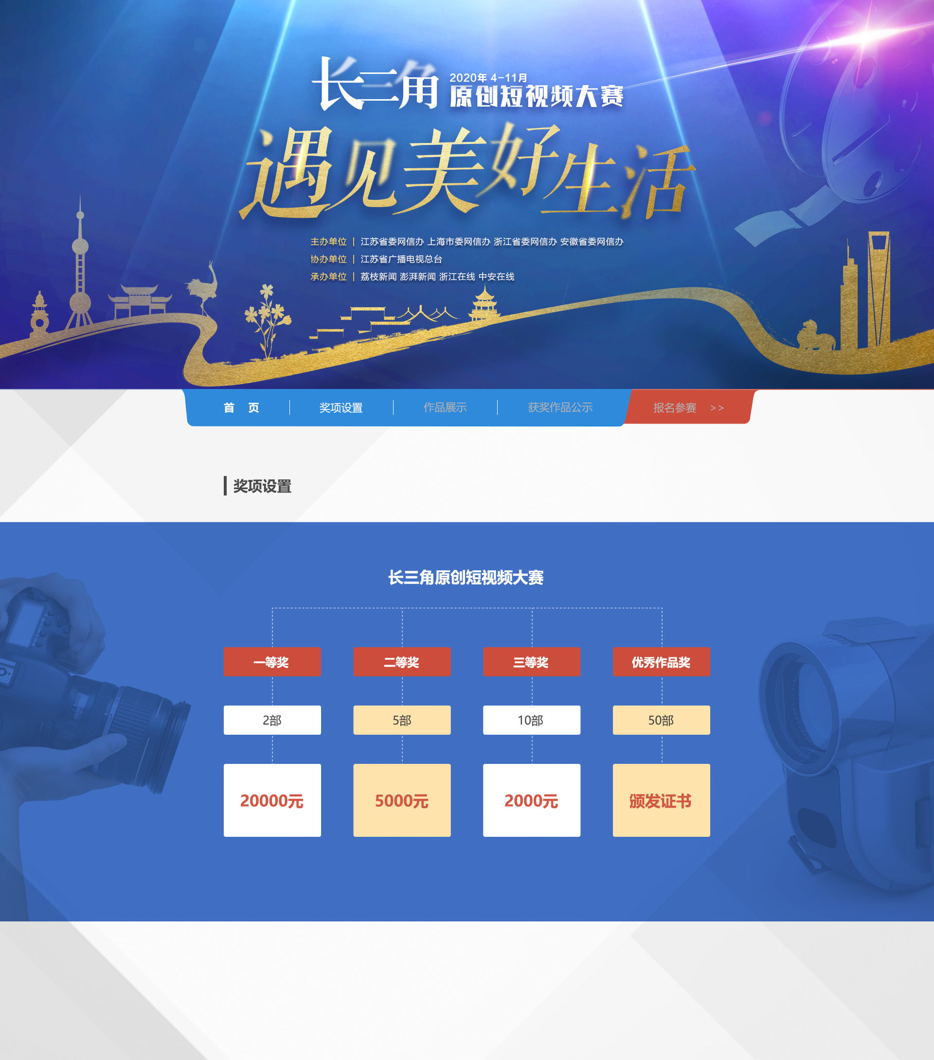 獎(jiǎng)項(xiàng)設(shè)立豐富且權(quán)威!機(jī)會(huì)屬于你! 參賽方式包容并蓄,不拘一格邀佳作!大賽設(shè)立“遇見美好生活”——主單元,與“小康”模樣——特別單元,橫(屏)豎(屏)皆可,甜咸不忌。關(guān)于我們所處的這個(gè)美好時(shí)代、身邊的美好生活,發(fā)現(xiàn)、記錄或是講述,敬請點(diǎn)燃你的創(chuàng)作小宇宙,不吝賜教。 劃重點(diǎn)!關(guān)于本次大賽你需要知道的一切—— 【Q:“遇見美好生活”長三角原創(chuàng)短視頻大賽是什么?】 這是一個(gè)集權(quán)威性、含金量、影響力于一身的專業(yè)性大獎(jiǎng)賽!它將以解讀、詮釋全面小康的深刻內(nèi)涵為主題,面向長三角乃至全國視頻愛好者和網(wǎng)友發(fā)出創(chuàng)作邀約。 【Q:誰可以參賽?】 熱愛短片創(chuàng)作的任何個(gè)人和集體。 【Q:大賽主題是什么?】 “民亦勞止,汔可小康。”綺麗愿景穿越千年,在我們身處的這個(gè)時(shí)代,照進(jìn)現(xiàn)實(shí)。今年的大賽主題是“遇見美好生活”,旨在透過不同創(chuàng)作主體的多方視角,鼓勵(lì)綜合運(yùn)用多種視頻表現(xiàn)手法和呈現(xiàn)方式,點(diǎn)贊長三角地區(qū)小康社會(huì)建設(shè)取得的豐碩成果,聚焦人民幸福安康的美好生活。 【Q:參賽作品分幾類?】 1、主單元——“遇見美好生活” 。1)微電影 。2)微紀(jì)錄片 。3)公益短片 (4)動(dòng)畫短片 2、特別單元——“小康”模樣 【Q:參賽作品要求?】 1、內(nèi)容題材要求 主單元——“遇見美好生活”:透過城鄉(xiāng)建設(shè)、行業(yè)發(fā)展、家庭變遷、個(gè)人成長等不同維度,聚焦長三角地區(qū)全面小康的生動(dòng)實(shí)踐,用光影描繪美好生活。題材不限,形式不限。 特別單元——“小康”模樣:以“微訪談”、隨手拍的形式,展現(xiàn)不同群體心中的“小康”模樣。視頻需為豎屏形態(tài)。 參賽作品必須符合國家法律、法規(guī)和版權(quán)有關(guān)規(guī)定,無色情、暴力、血腥等不良內(nèi)容。要求題材好、創(chuàng)意新,契合主題、情節(jié)完整。 2、時(shí)長要求 所有作品時(shí)長只需3分鐘 無論是報(bào)送主單元或是特別單元,都不要超過3分鐘哦。 3、格式要求 參賽作品以mp4為主,avi、flv、mpg、wmv為備選格式。特別單元參賽作品需為豎屏短視頻。 4、上傳要求 參賽作品大小控制在300M以內(nèi),如超過建議壓縮后上傳。 5、版權(quán)要求 參賽作品必須由參賽者本人(或單位)原創(chuàng),嚴(yán)禁剽竊、抄襲,參賽者應(yīng)擁有作品的著作權(quán)。主辦方對全部參賽作品具有免費(fèi)使用權(quán)。主辦單位不承擔(dān)包括(但不限于)肖像權(quán)、名譽(yù)權(quán)、隱私權(quán)、著作權(quán)、商標(biāo)權(quán)等糾紛而產(chǎn)生的法律責(zé)任,如出現(xiàn)上述糾紛,主辦方保留取消其參賽資格及追回獎(jiǎng)項(xiàng)的權(quán)利。 6、創(chuàng)作時(shí)限 參賽作品必須是網(wǎng)絡(luò)首發(fā),并且是2020年1月1日起創(chuàng)作的短片。 【Q:獎(jiǎng)項(xiàng)設(shè)置】