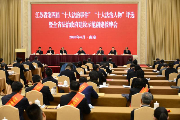 4月29日,江蘇省委全面依法治省委員會辦公室召開會議,貫徹落實省委全面依法治省委員會第三次會議精神,發布省委依法治省辦會同省委宣傳部、省司法廳聯合開展的江蘇省第四屆“十大法治事件”“十大法治人物”評選結果,為全省法治政府建設示范單位授牌。