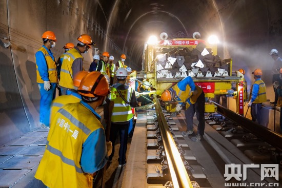 大臨鐵路正式鋪軌(央廣網(wǎng)發(fā) 通訊員供圖) 中國鐵路昆明局集團(tuán)滇西鐵路建設(shè)指揮部副指揮長馬建華介紹,為克服疫情影響,確保按時保質(zhì)保量完成任務(wù),鐵路部門組織各參建單位按照“大干100天,決勝大臨鐵路”的目標(biāo),加班加點趕進(jìn)度,全力推進(jìn)剩余工程建設(shè)。截至目前,全線隧道工程已完成設(shè)計總量的97.5%,橋梁完成97.9%,路基土石方97.6%。