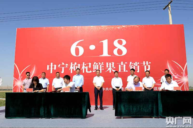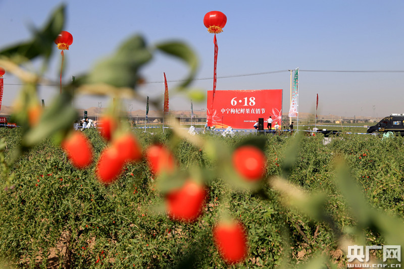 火紅枸杞映襯中的6.18活動(央廣網發 通訊員張潔龍 攝) 央廣網銀川6月18日消息(記者徐升)今天,“6·18”中寧枸杞鮮果直銷節在寧夏中寧縣啟動。中寧縣委書記陳宏做客線上直播間與主持人共同推介中寧枸杞,超過70多萬網友進入直播間觀看了線上直播活動。