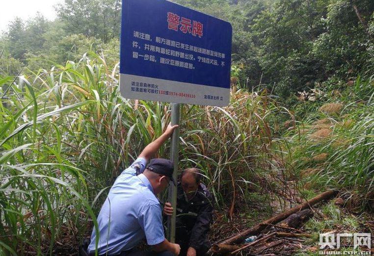 民警在溪坑旁樹立警示牌(央廣網發 通訊員供圖) 央廣網寧波6月21日消息(記者曹美麗 通訊員段曉鵬 張飛)越來越多的驢友選擇去“探險”,他們專走偏僻野路,雖然險中求樂,但危險也隨之而來。在寧波市四明山區,每年都會發生十幾起“驢友”遇險求助警情。有沒有辦法減少驢友“遇險”事件的發生?近日,位于寧波四明山區的龍觀鄉派出所想出了一個“土辦法”:他們在山區險要位置新設了20塊警示牌,警示牌除了勸導游客文明旅游外,還可以充當救援“定位器”的作用。 每年發生緊急救援事件十幾起 寧波市海曙區龍觀鄉有五龍潭風景區、半山半水度假村、中坡山森林公園等等,頗受游客歡迎。 “喂,朱教導,我是南坑村的老李頭,上午我們見過面聊過的。你們走后不久就來了批游客,他們點了火在燒烤,我和你們反映一下。”6月13日下午,龍觀鄉的一位村民向派出所教導員朱建波反映。 “還有許多游客喜歡來這野餐、燒烤。有些帶著小孩的一家人,鋪個小墊子,支個燒烤架就開始燒烤。有次有戶游客引火把雜草燒起來,幸好就在溪邊,拿水潑滅,才沒出大事。”清溪附近“龍觀禪那”民宿的老板說。 相比火災而言,最揪心的還是一些緊急救援的事情。比如在該鄉中坡山的小瀑布,有游客就把帳篷搭在旁邊,但是山里的天氣陰晴不定,風雨大時,山夾谷間溪坑里的水漲起來,很快就漫過大腿,非常危險。還有些甚至在溪上的大塊石頭上搭帳篷,由于天氣預報的偏差或者低估了雨量,就被上漲的溪水困住。“每年夏天,都能遇十幾起這樣的救援,讓我們疲于應對。”朱建波說。