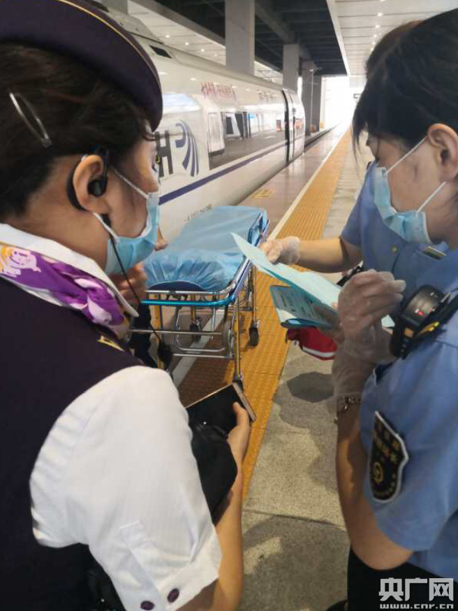 旅客乘車突發疾病(央廣網發 通訊員供圖) 18點38分,G2805次列車提前2分鐘到達阜陽西站,此時,值班站長楊靜、值班員穆書雯、120救護人員已在9號站臺G2805次列車2號車廂停靠位置提前到位。列車停穩后,楊靜、穆書雯立即配合急救人員將處于昏迷狀態的旅客抬上擔架,平穩有序地將急救旅客送上急救車。