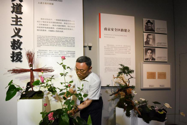“花語”訴和平。(蔡美婷 攝) 上午9點,活動在紀念館史料陳列廳“人道主義救援”展區舉行。展區前設著幾張花臺,花臺上,破碎的瓦片覆蓋著碧綠的苔蘚,在瓦片的縫隙中,白掌參差錯落,綠松傲然挺立,用紅端木制作的“紅十字”裝置肅立在展區入口。儀式中,侵華日軍南京大屠殺遇難同胞紀念館館長張建軍將一束粉色的和平月季置于盆景中,整部象征和平的花語作品宣告完成。