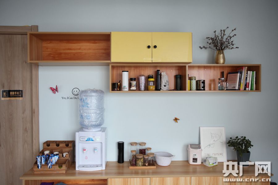 舒適安靜的學(xué)習(xí)環(huán)境(央廣網(wǎng)記者 徐升 攝) 學(xué)習(xí)區(qū)外,是氣氛相對(duì)輕松的公共區(qū),提供有茶水、電腦、打印機(jī)、微波爐等,還有供多人同時(shí)討論、自習(xí)的討論間。公共區(qū)的墻上,一塊留言板上貼滿了便利貼,或?yàn)樽约杭佑凸膭,或是確定一個(gè)小目標(biāo),每一張便利貼都是青春和拼搏的記憶。