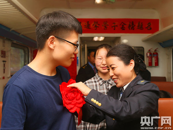公益慢火車的乘客車雅玲如愿考上大學(央廣網發 通訊員張雁南 攝) “孩子們,今年我們小慢車的通學學生里,有7人考上了大學,現在讓我們揭開‘高考金榜’,一起來看看他們都是誰。”列車從馬蹄灣站開車后,6063次列車長向寶林一邊說著一邊揮手掀開了紅綢,只見一張紅紙金字的“高考金榜”展現在所有人眼前,上面7名“準大學生”拿著錄取通知書喜笑顏開的照片吸引了所有人的注意。 “封清杰考上西安工業大學,高璇考上了西安外國語大學,梁欣瑤被西安醫學院錄取……”向寶林車長念著榜單,受邀來到車上的5名“準大學生”依次走上前,列車工作人員為他們佩戴上大紅花,“通學車廂”還為他們準備了鋼筆、筆記本等學習用品作為禮物。最讓孩子們暖心的是,列車工作人員發現他們全都考上了西安的院校,便特意為他們辦了西安的“長安通”乘車卡,初到西安,孩子們坐地鐵、公交就一下子方便了很多。最后,封清杰、車雅玲作為代表,還對車廂內的學弟學妹們講述了高考心得、傳授了學習經驗,并送上了自己對弟弟妹妹們最美好的祝愿。