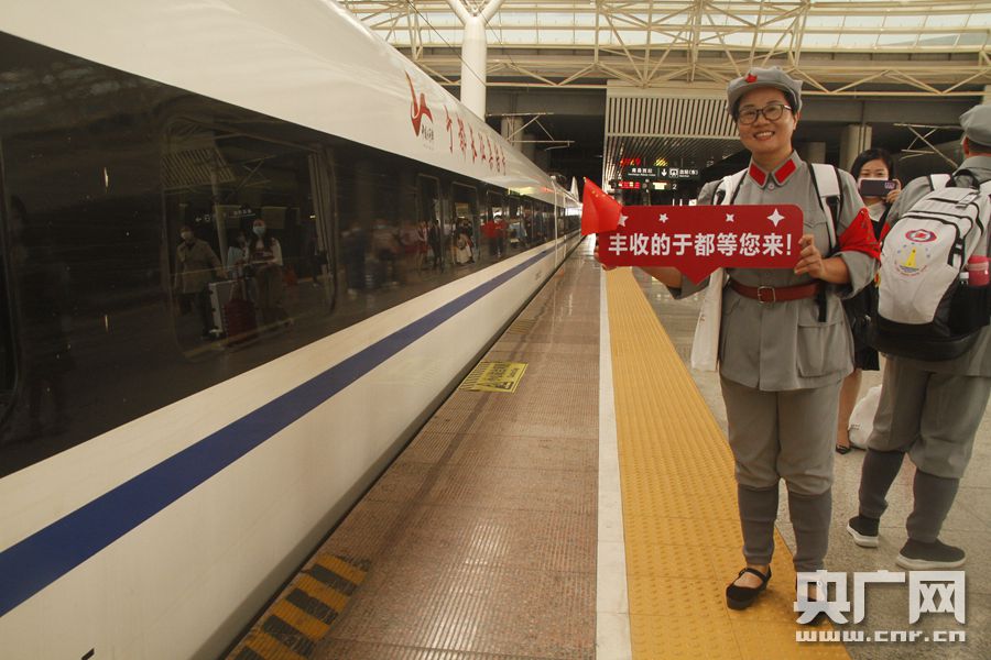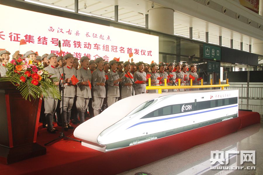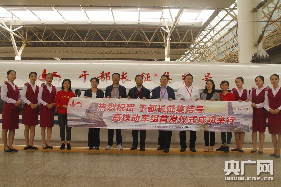 “于都長征集結號”冠名動車組首發 (央廣網發 通訊員供圖) 據悉,該列車由中央紅軍長征集結出發地江西于都冠名,運行時間為一年,共1列車次8節車廂。投放形式包括車身彩貼、展牌、小桌板、列車廣播等多種媒體形式的組合,旨在打造一張馳騁于昌吉贛高鐵線上的“流動名片”,全方位展示于都文化旅游品牌形象。于都縣文廣新旅局局長謝蕓華說,昌吉贛高鐵的開通運行,于都到南昌由原先乘坐列車的五個多小時縮短到兩個小時?s短兩地時間距離的同時,也直接拉近了贛南原中央蘇區與長三角、珠三角、閩東南經濟帶距離,將更好地助力于都的振興發展。