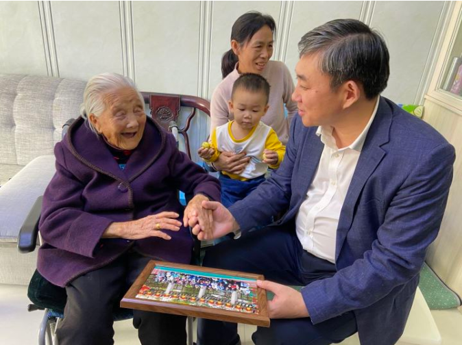 93歲朱春芳老人的全家福。 據了解,此次收到重陽大禮包的還有轄區內的退役軍人家庭、計劃生育特殊家庭的老人以及貧困、獨居、空巢、失能的老人。如城街道針對不同對象分類施策,通過“定制”幸福、榮光、愛心、安心、暖心等不同主題的重陽大禮包,在空巢獨居老人中開展志愿者“每日關愛”活動,對敬老院老人開展“重陽大聯歡”活動……同時聽取訴求,幫助他們排憂解難,著力解決老百姓最關心的民生問題,切實增強群眾的參與感、獲得感和幸福感,讓全社會共享小康成果。