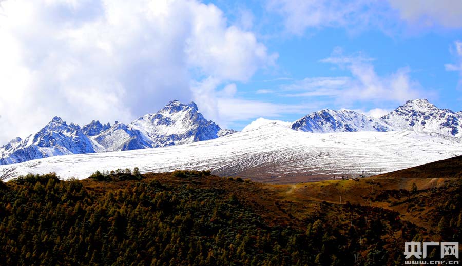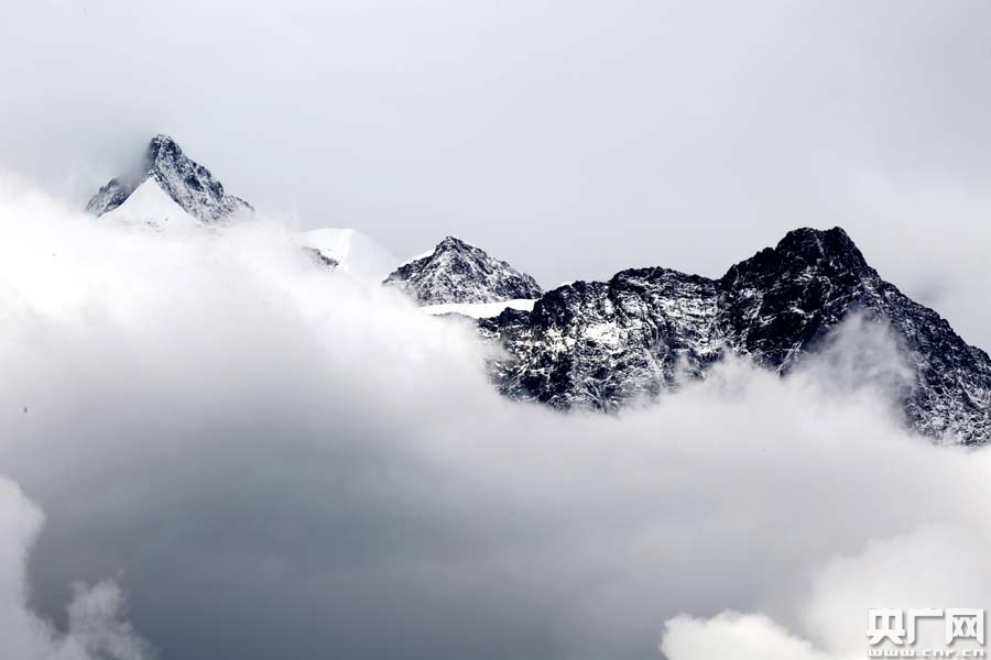 梅里雪山主峰卡瓦格博峰從云層中露出神秘容顏(央廣網記者張雷 攝) 當天早晨,采訪團從西藏昌都市芒康縣曲孜卡鄉出發,沿著214國道南行110多公里,來到云南省迪慶藏族自治州德欽縣境內、瀾滄江邊的梅里雪山。隔江相望,海拔6740米梅里雪山主峰卡瓦格博峰難得的從流動云層中露出了神秘容顏,很快又被云霧遮住,所幸記者用鏡頭快速拍下了這一瞬間。而陽光不時從云隙中映照在梅里雪山下的村落,給人以世外桃源的感覺。 繼續前行70公里,沒有梅里雪山名氣大的白馬雪山則非常慷慨地將海拔5430米的主峰以及20座海拔5000米以上的山峰一覽無余地展現,吸引了采訪團和眾多游客停車觀賞。