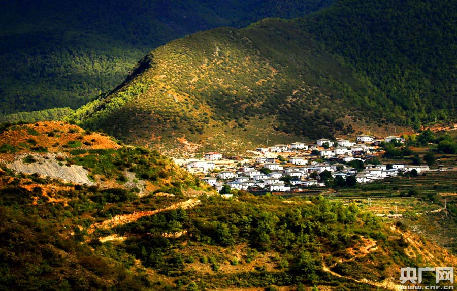 陽光從云隙中映照在梅里雪山下的村落,給人以世外桃源的感覺(央廣網記者張雷 攝)