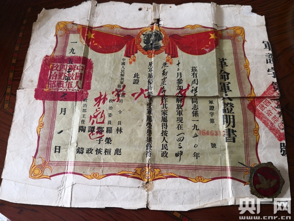 周祖光珍藏的參軍證明書(總臺央廣記者姜文婧 攝) 周祖光回憶,49團原本直接被派往抗美援朝前線,上級考慮到剛成立的49團都是新兵,把49團編入48軍143師,并將該團先派往廣東參與剿匪行動,又從廣東跋山涉水到兩湖交界修建荊州大堤。1952年新年伊始,周祖光所在部隊突然接到命令:“北上!”每人背30斤的包袱,一支機槍,從遼寧丹東入朝。 周祖光說:“當時一心跨過鴨綠江!從鴨綠江一直走到朝鮮三八線,走了半個月夜路,腳都走破了。但我是老兵了嘛,我精力蠻足,還幫戰友背東西,哪個背不動幫哪個背。”雖然當時的周祖光軍齡也不過兩年,但他總是自稱“老兵”——“老兵”意味著多一份責任和擔當。 為躲避敵機轟炸,周祖光所在的部隊白天躲在山洞里休息,夜里行軍,就這樣一走就是大半個月。這一路上十分艱苦,到達三八線前時,周祖光的鞋子被自己的血染成了紅色。 到了目的地,部隊剛駐扎下來,空中響起了飛機聲,高空中是美國戰斗機、低空中是轟炸機、偵察機,一天沒斷頭。個性機敏的周祖光被分派看守我軍的軍庫。當時,我軍軍庫是敵人偵察的重點目標,不時有特務溜到山上窺伺。周祖光感到自己責任很重大,他到現在都記得那時的一聲槍響。 有一天晚上,周祖光在軍庫旁邊站崗。因為已經連續幾天值守,他實在疲勞極了,也困極了。平時,夜里值守周祖光從不坐下,就是怕自己犯困。可那個夜里,他困得站著也睡著了,突然,周祖光感到自己手中的槍被人抓住,一個激靈就醒了。睜眼一看,是一臉怒氣的副排長站在眼前。周祖光回憶道:“副排長把我的槍一掄起來,說:‘你還打瞌睡?特務來了把你殺了也不不曉得!’”誰也沒想到,就在這天夜里,山上突然傳來一聲槍響。駐地的氣氛緊張到極點。直到第二天天亮,部隊才知道原來是偷偷溜上山的敵軍特務把老百姓打死了。知道這個消息后,周祖光意識到,作為戰士是一刻也不能松懈的,因為敵人是如此兇殘,也因為自己肩上擔負的責任和使命。 隨著前線的戰斗越來越激烈,周祖光和戰友白天把軍庫還有后勤倉庫都偽裝起來,夜里打著手電筒偷偷照明,為前線補充物資。周祖光回憶,在一次激烈的戰斗中,敵軍用毒氣彈、轟炸機伏擊了志愿軍,造成傷亡十分慘重,原本在后方負責后勤保障的周祖光也沖上了戰斗一線。 “剛上前線,首先(最開始)也怕,后來為什么就不怕了?我覺得,我是一個老兵了,仗也打過,建設也搞過,我槍法還打得蠻好,我要堅持完成這個任務!就咬起牙根來。” 周祖光記得,有一次美軍對當地一個小山村狂轟濫炸了整整一天,第二天清晨,周祖光和兩個戰友來到一片死寂的村里,上山觀察地形。沒想到,美軍的轟炸機又迎面襲來。周祖光眼疾手快,將一個東北的戰友拉到一處土墻后面,還有一個四川的戰友年紀很小,當時嚇懵了,本能地就往外跑去。周祖光大喊:“你不要跑!要死就死在這里!” 近一個月的激烈戰斗,每天都有傷員被轉運下來,缺手、缺腳的傷員隨處可見,周祖光面對這些戰友,第一次流下了眼淚。他珍藏著一本通訊錄,戰斗的間隙,他就四處收集戰友的信息。“我把戰友的名字,老家的地址,都寫在上面。夜晚卡著電筒寫,寫什么呢?你是哪兒來的,我是哪兒來的。為什么要寫下來呢,怕他犧牲,犧牲了我要到他屋里(家里)去看一下,我可以幫他們捎個信,我們就這樣互相寫。” 1953年7月,周祖光領到了一枚上面刻著和平鴿的紀念章,隨部隊回到了祖國。1956年退伍后,他沒有給政府提任何要求,默默地回到湖南老家五里牌村種地務農。他后來有三個兒子,但他很少跟后人提自己在抗美援朝的經歷,唯有一枚銹跡斑斑的和平紀念章,珍藏在老人的箱子里。 1979年,對越自衛反擊戰打響,周祖光的二兒子周克林作為軍人參戰,在中越邊境法卡山戰斗中犧牲,立下二等功,年僅19歲。從此周祖光的和平紀念章邊上,多了一枚軍功章。周祖光說:“我有三個兒子,從小我就跟他們說,當兵很光榮,年輕人就要去保衛祖國。老子當兵,兒子也當兵,我那個小鬼犧牲了,我曉得打仗是死人的,為人民死,死得光榮!”