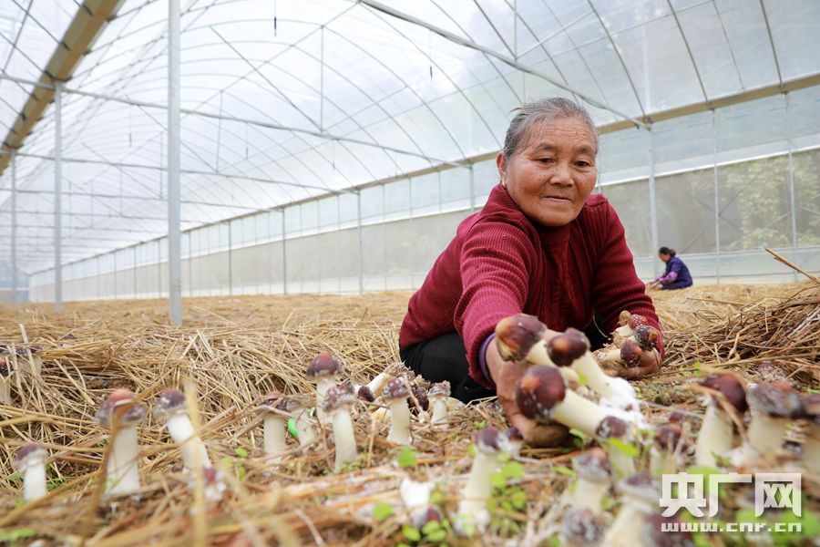 在江西省吉安市吉水縣周嶺林場林下食用菌種植基地,林場工作人員正在采摘成熟的食用菌(央廣網發 通訊員供圖)