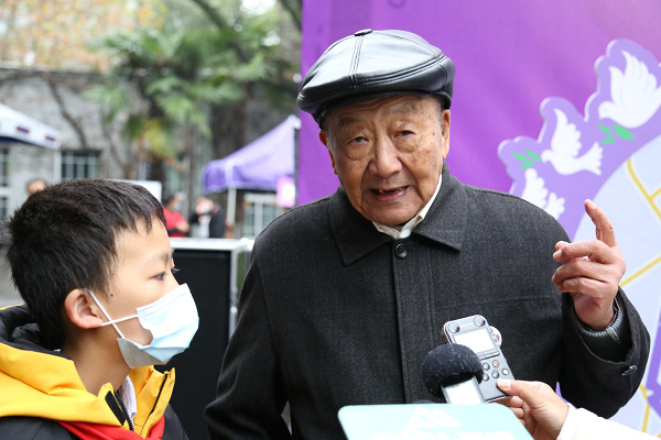 83年前的11月,日軍逼近南京。面對即將到來的戰(zhàn)爭與災難,約翰·拉貝、明妮·魏特琳、約翰·馬吉、羅伯特·威爾遜、喬治·費奇等來自美國、德國等國家的20多位國際友人,冒著生命危險組建了南京安全區(qū)國際委員會,建立難民收容所,庇護了25萬多難民。鼓樓醫(yī)院1892樓正是當年的病房樓,作為當時南京城內(nèi)唯一的外科醫(yī)生,美國醫(yī)生羅伯特·威爾遜在這里,與中方醫(yī)護人員一道,搶救了一個個難民的生命。今天,83名愛好和平的人士重走安全區(qū),向他們的人道主義精神致敬。 在活動現(xiàn)場,南京大屠殺幸存者葛道榮拉著小學生鄧言的手說:“當年我10歲,比你還小,天天忍饑挨餓,四處逃難。你現(xiàn)在很幸福,可以安全地在學校讀書,我們的國家強大了,你一定要好好學習。”11歲的鄧言是將軍山小學的六年級學生,他說一定會懷著感恩的心珍惜現(xiàn)在的和平生活。