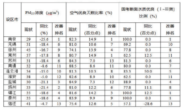 注:(1)各設區市環境空氣質量改善排名依據相關約束性指標同比情況進行排序,其中PM2.5濃度同比負值為改善,正值為惡化;空氣優良天數比率同比正值為改善,負值為惡化。(2)各設區市水環境質量改善排名綜合考慮國考斷面水質優良比例現狀與同比情況進行排序,同比正值為改善,0為持平,負值為惡化,其中所有改善和持平的設區市按照現狀值進行排序,所有惡化的設區市按照同比情況進行排序。