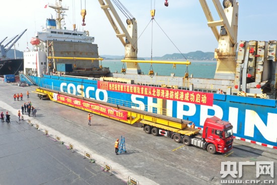 防城港碼頭(央廣網發 通訊員陳磊 攝) 央廣網防城港11月29日消息(記者鄧君洋 通訊員宋斯麗 陳潔)11月28日上午,隨著一聲鳴笛,一根50米長的鋼軌被緩緩吊上油輪,標志著我國高鐵“整體出口”的第一單——印尼雅萬高鐵出海的第一批鋼軌在防城港碼頭首航成功,這也標志著中國成為全球為數不多可進行長定尺鋼軌出口的國家之一。 中國與印度尼西亞合作建設的雅萬高鐵全長142.3公里,是東南亞第一條最高設計時速350公里的高鐵。據了解,雅萬高鐵項目所需鋼軌在2020年1月底確定由攀鋼集團有限公司(以下簡稱“攀鋼”)生產制作。