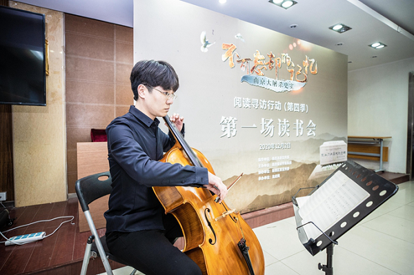 大提琴演奏《悲傷的大提琴》 今年是侵華日軍南京大屠殺慘案發生83周年,即將到來的12月13日是第七個國家公祭日。在讀書會上,大家共同閱讀了《南京浩劫——被遺忘的大屠殺》一書。該書由已故著名華裔作家張純如女士所作。1995年,張純如勇敢地選擇直面人類歷史上那一段慘絕人寰的記憶,親身訪問了多名幸存者,參閱了大量歷史文獻,在各種觸目驚心的資料的基礎上,用自己的努力和勇氣,撰寫、出版了該書,引起了西方世界的震驚,也引發國際社會的深刻反思。