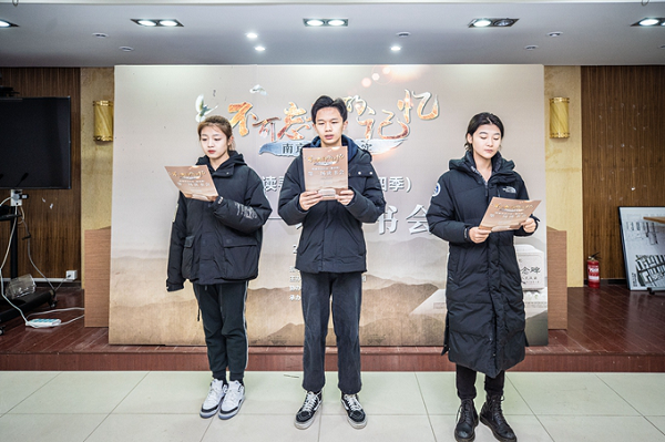 南京傳媒學院的大學生讀書會成員朗讀 《南京浩劫——被遺忘的大屠殺》一書譯者、當年曾陪同張純如在南京采訪的江蘇省行政學院教授楊夏鳴現場回憶了張純如在南京采訪調查的經歷,講述了該書為維護歷史真相、捍衛人類正義做出的突出貢獻并對研究南京大屠殺史及其傳播帶來的深厚影響。