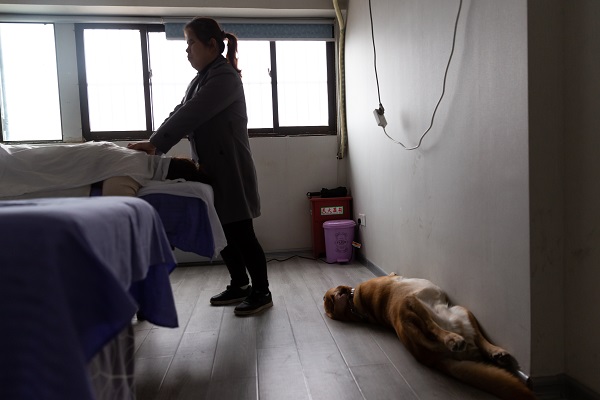 通常一次推拿的時間要1個小時左右,祝愛葉工作的時候,多多便安靜的守在一旁,更換各種姿勢養精蓄銳。