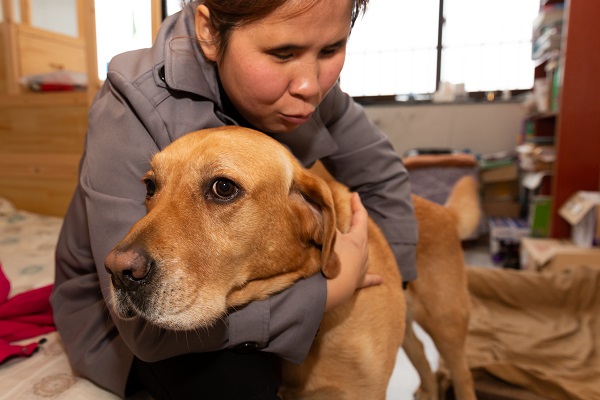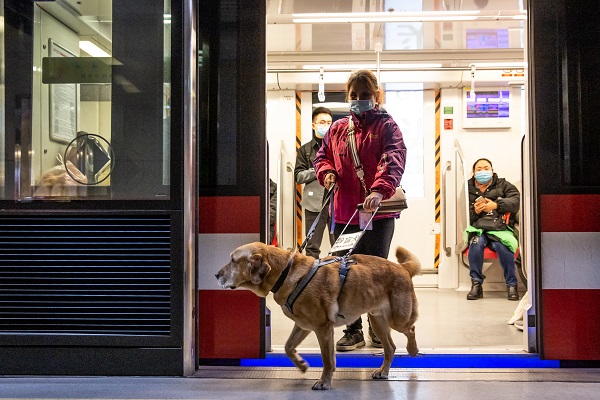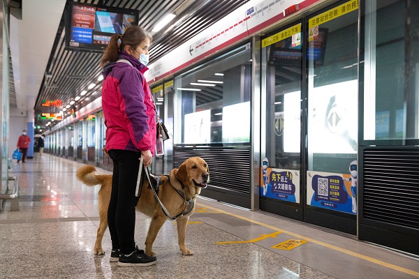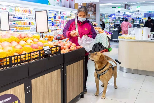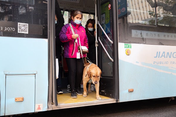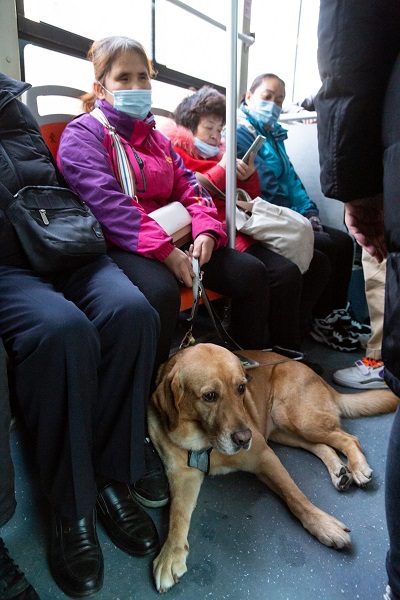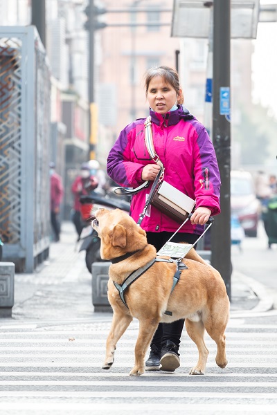 祝愛葉今年45歲,是一位先天失明的盲人,和同是盲人的丈夫在南京經營著一家按摩店已有十余年。2013年,她向中國導盲犬大連培訓基地提出申請,經過4年的排隊、匹配、考察以及對她1個半月的培訓,2017年底,祝愛葉將導盲犬多多領回了南京,多多也成為了南京第一只導盲犬。導盲犬多多今年5歲了,它的到來,不但給祝愛葉帶來了生活上的便利,也擴大了她的生活圈,成了她心靈上的陪伴。 日常生活中,作為一只工作犬,多多和祝愛葉寸步不離,無論她工作、休息,甚至愛葉去黃山旅游,多多都在一旁守護著她。祝愛葉說,多多已經成為了她的一部分。根據中國殘聯2012年6月26日發布的統計數據(中國殘疾人聯合會《2010年末全國殘疾人總數及各類、不同殘疾等級人數》),中國的視力殘疾人數在2010年達到了1263萬人。南京市殘聯統計數據,截止2020年11月底南京市視力殘疾人數為20629人。據中國導盲犬大連培訓基地統計,從該基地畢業并輸送到江蘇的導盲犬登記在冊的為17只,南京為5只(1只已退役)。(張夢)
