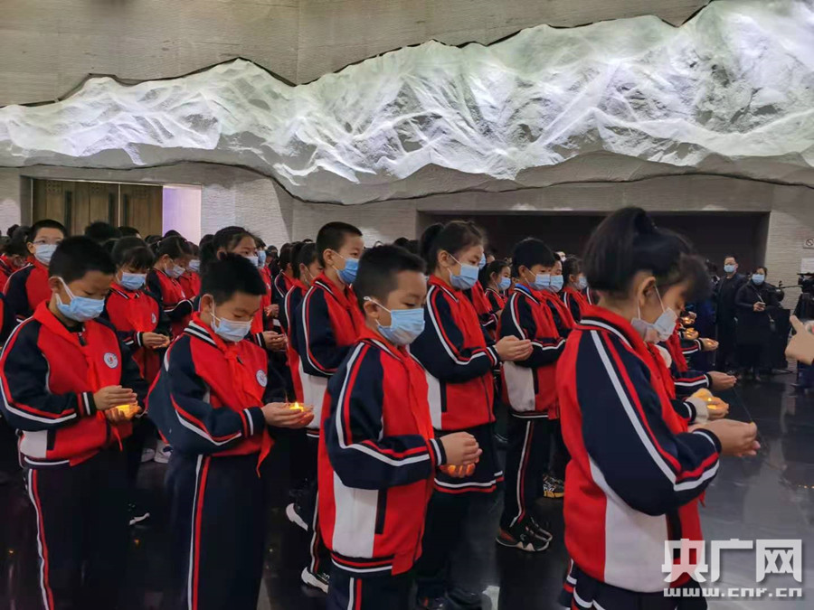 學生代表列隊朗誦公祭鼎銘文(央廣網(wǎng)記者 張靜 攝) 隨后,現(xiàn)場參加公祭悼念活動的各界人士,列隊緩步到寓意著民族英烈浩氣長存的臥碑前,俯身敬獻手中的蠟燭,以表哀思。
