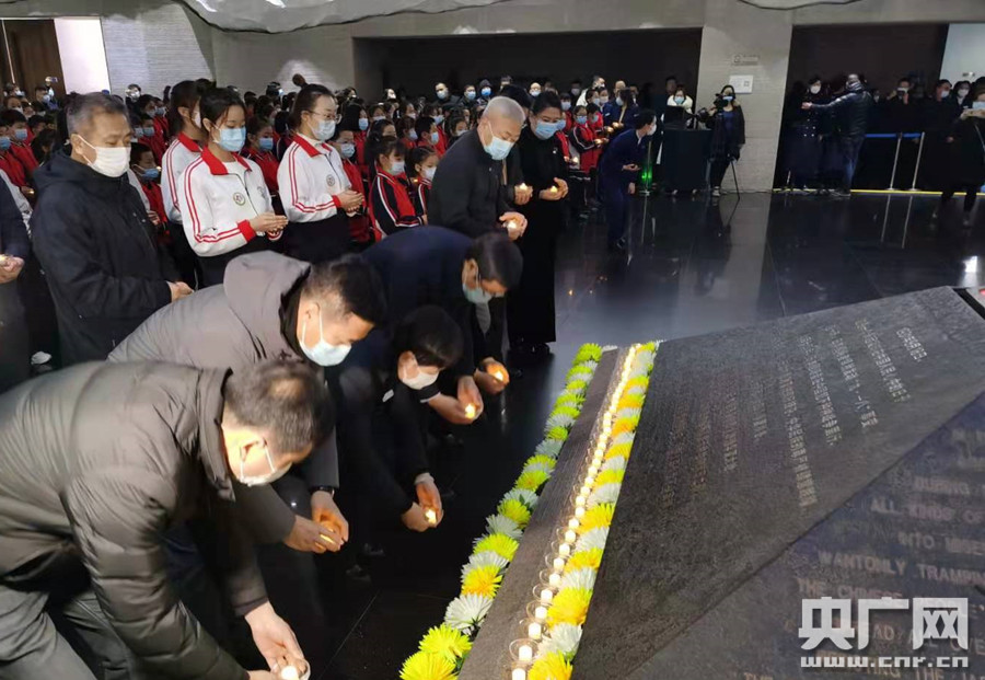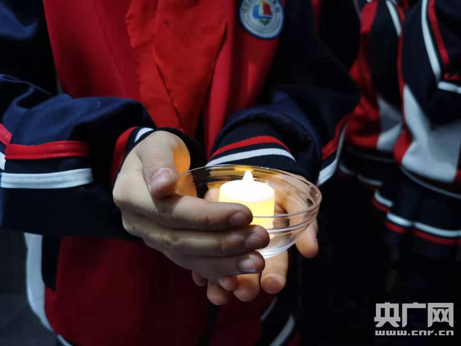 上午10點30分左右公祭悼念活動開始,全場人員齊唱中華人民共和國國歌。國歌唱畢,全體人員秉燭低首肅立,為死難同胞默哀。 ![]() 全場默哀(央廣網(wǎng)記者 張靜 攝)