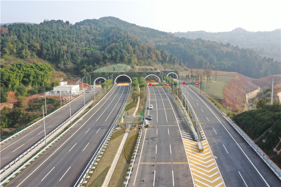 成都天府國際機場高速公路(央廣網發 中國中鐵城投成都分公司供圖) 值得一提的是,成都天府國際機場高速公路龍泉山隧道采用的雙向十車道客貨分流四洞并行設計為全國首創。龍泉山隧道,全長4617m,隧道設計速度為120km/h,為分離式雙向四洞十車道。根據預測,將來新機場高速公路的車流量在10萬輛左右,由于進隧道時車流量會下降5%左右,由此龍泉山隧道采用了雙向十車道設計,比主線多兩條車道,設計時速120公里且客貨分流,貨車從兩側隧道通行、小車從中間隧道通行,互相不影響。龍泉山隧道照明采用無級調光技術,根據車流量大數據和隧道內外光照情況,適時無極調整洞內LED燈照度;加密設置被動反光設施、增設全斷面反光環,有效指引道路線形,改善洞內照明,大大降低運營期能源消耗。