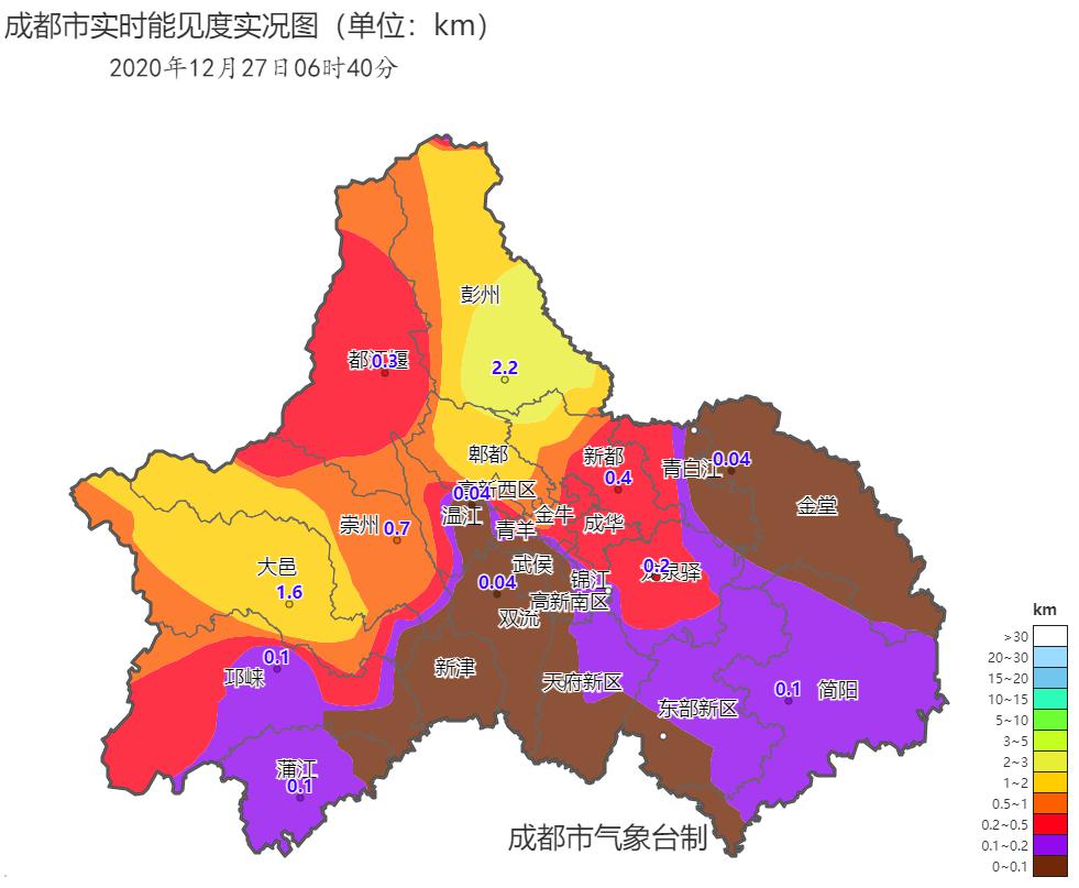 成都市27日06時40分能見度(單位km)(央廣網發 成都市生態環境局供圖) 成都平原環境氣象中心主任華明在接受記者采訪時表示。“成都位于四川盆地底部,盆地四周為山脈和高原所環繞,地形閉塞,大氣的水平流動弱,與外界空氣交換性差,風速小。進入秋冬季節,來自西南的暖濕氣流在盆地內堆積,相對濕度較高,多云霧天,逆溫層出現頻率高,持續時間長,導致大氣層結多處于穩定狀態,不利于大氣污染物的擴散,使得成都秋冬季易出現霧、霾天氣。” 華明說:“今年12月上、中旬冷空氣影響頻繁,氣象擴散條件較好,但自12月20日起,成都市進入持續靜穩天氣狀態,氣象擴散條件逐漸轉差。25日起,成都中低空轉為偏南濕潤氣流影響,濕度迅速上升,但無降雨出現,導致云量多,垂直湍流弱,混合層高度較低,不利于污染物垂直擴散;加之無冷空氣影響,近地面風速小,氣象擴散條件迅速惡化。” 對于27日出現的大霧,華明表示,27日成都地區為陰天,出現大霧天氣并長時間維持,近地面濕度高,風速小,能見度差,加之近地面有強逆溫存在,氣象擴散條件進一步惡化,非常不利于空氣污染物的擴散、稀釋和清除。 那大霧什么時候能夠消散?華明表示,預計28日氣象擴散條件仍然很差,29日前后受強冷空氣影響有一次明顯的降溫降雨天氣過程,近地面轉為偏北風,風速增大,冷空氣主體將于29日凌晨左右影響成都地區,氣象擴散條件將有明顯改善。” |