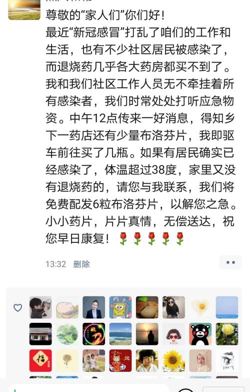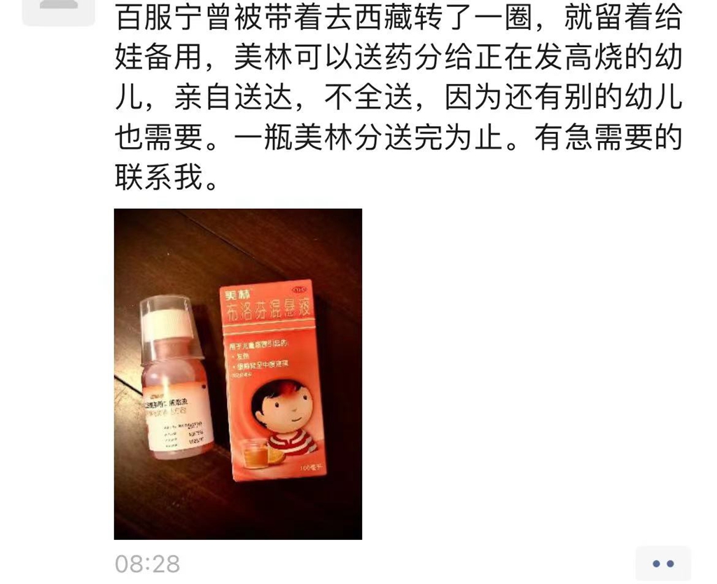 “百服寧曾被帶著去西藏轉(zhuǎn)了一圈,就留著給娃備用,美林可以送藥分給正在發(fā)高燒有需要的幼兒,不全送,因為還有別的幼兒也需要。一瓶美林分送完為止。有急需要的聯(lián)系我。”12月19日上午,市民朱紅在微信朋友圈發(fā)布了一條藥品“共享”信息。上午11時許,市民陳女士(化名)便聯(lián)系上朱紅,表示家中有人需要幾粒布洛芬。了解情況后,朱紅和陳女士約定好地點,并把4顆布洛芬藥片包裝好,再放在約定地點的花壇上,陳女士取完藥后再離開,全程保持無接觸狀態(tài)。
