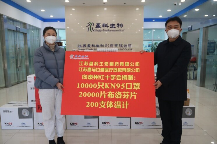 23日上午,江蘇盈科生物制藥有限公司及旗下子公司江蘇喜馬拉雅醫療器械有限公司,向泰州紅十字會捐贈一批防疫急需物資,包括1萬只KN95口罩、2萬顆布洛芬片和200支體溫計。