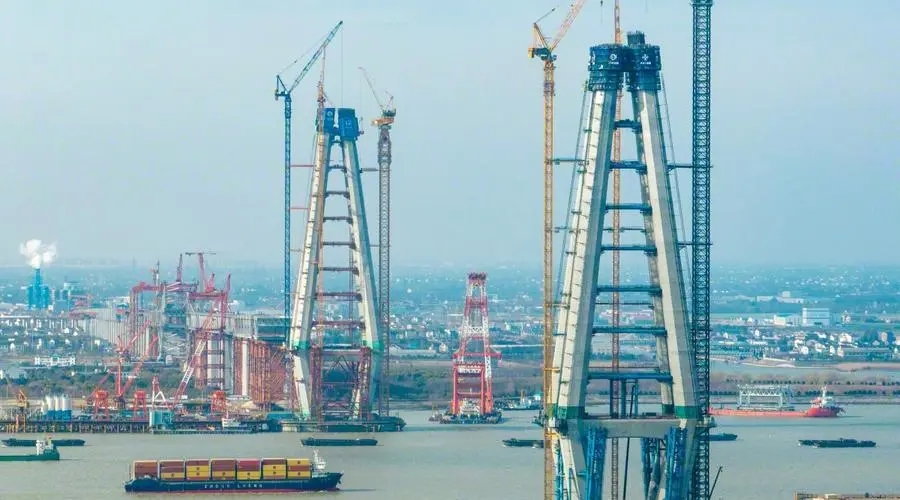 2022年,該園區全年地區生產總值118億元,同比增長5.6%;開票銷售750億元,同比增長9%;規上工業產值234億元,同比增長11.9%。 “企業在跨江融合發展過程中,不僅僅在產業轉移的過程中獲得了新的資源、新的平臺和新的發展空間,企業的產業層次、發展能力也獲得了新的提升。”揚子江造船相關負責人表示。 奮勇爭先 ,跨江聯動“樞紐”示范 對泰州而言,“跨長江”是一個傳承千年的夢想。年輕的泰州,正以后起之秀之勇氣,以跨江融合發展為目標,統籌規劃、完善布局,加密過江通道建設,加快構建現代綜合交通運輸體系。 2023年2月1日,隨著2500噸浮吊船4個主鉤緩緩升起,重達1400噸的大節段鋼梁穩穩安放于滑移支架,常泰長江大橋主航道橋首個大節段鋼梁吊裝完成。 2023年2月3日,江陰靖江長江隧道建設進度邁出了重要一步,“匠心一號”大型盾構機已成功抵達長江南岸,在它一側,“聚力一號”盾構機也在全速推進,喜迎3000米掘進大關。 2023年2月9日,張靖皋長江大橋ZJG-C1標段南航道橋南主塔制造正式開工,標志著世界最高懸索橋鋼塔制造進入施工階段。