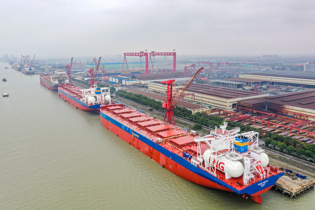 全國造船看江蘇,江蘇造船看靖江。近年來,江蘇靖江造船企業(yè)主動策應(yīng)“雙碳”發(fā)展戰(zhàn)略,堅持創(chuàng)新驅(qū)動,積極開展安全節(jié)能、綠色環(huán)保型船舶的生產(chǎn)、研發(fā),新時代造船成為全國首批建造大型LNG雙燃料船的地方民營船廠,成功挺進(jìn)代表造船工業(yè)最高水平、享有造船業(yè)“皇冠上的明珠”之稱的LNG船建造領(lǐng)域。 如今,LNG船正逐步成為靖江船企的“拳頭產(chǎn)品”。今年一季度,揚(yáng)子江船業(yè)簽訂兩艘17.5萬立方米LNG運(yùn)輸船建造合同;新時代造船目前已承接了21萬噸LNG雙燃料動力散貨船23艘,其中完工交付8艘,是當(dāng)前全球承接并在建紐卡斯?fàn)柎妥疃嗟拇螅沓薪恿?0艘兩型LNG雙燃料集裝箱船,成為目前國內(nèi)在建LNG雙燃料動力船最多的船企。